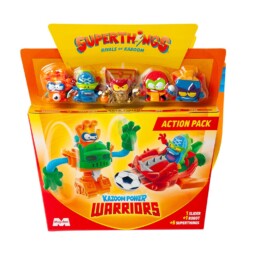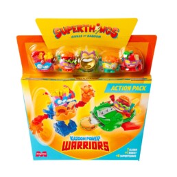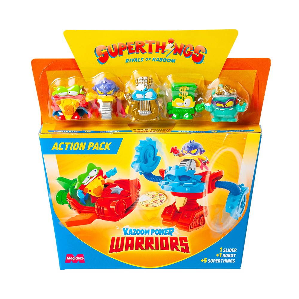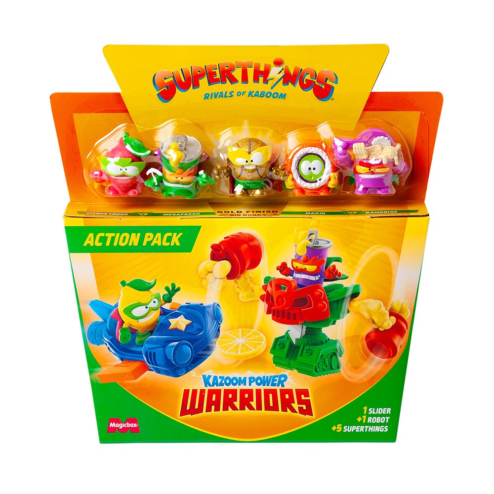 The battle continues! The Superthings Kazoom Power Warriors Action Pack is packed with more action than ever! Discover 5 figures (including 1 Golden Superleader), plus 1 Slider and 1 Rotosmasher robot.