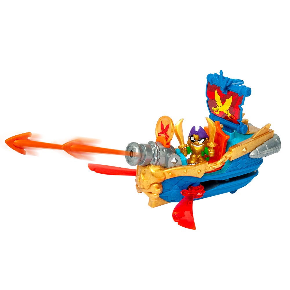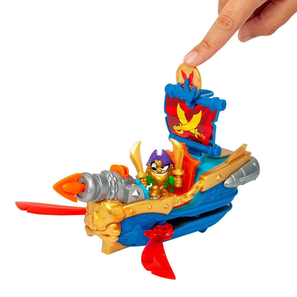 Join the Piratix fleet with the Skull Blade ship! This vessel hides a secret attack… Use the exclusive coin to activate it: two swords pop out on the sides to start the battle! Fire the projectile and go after the treasure!