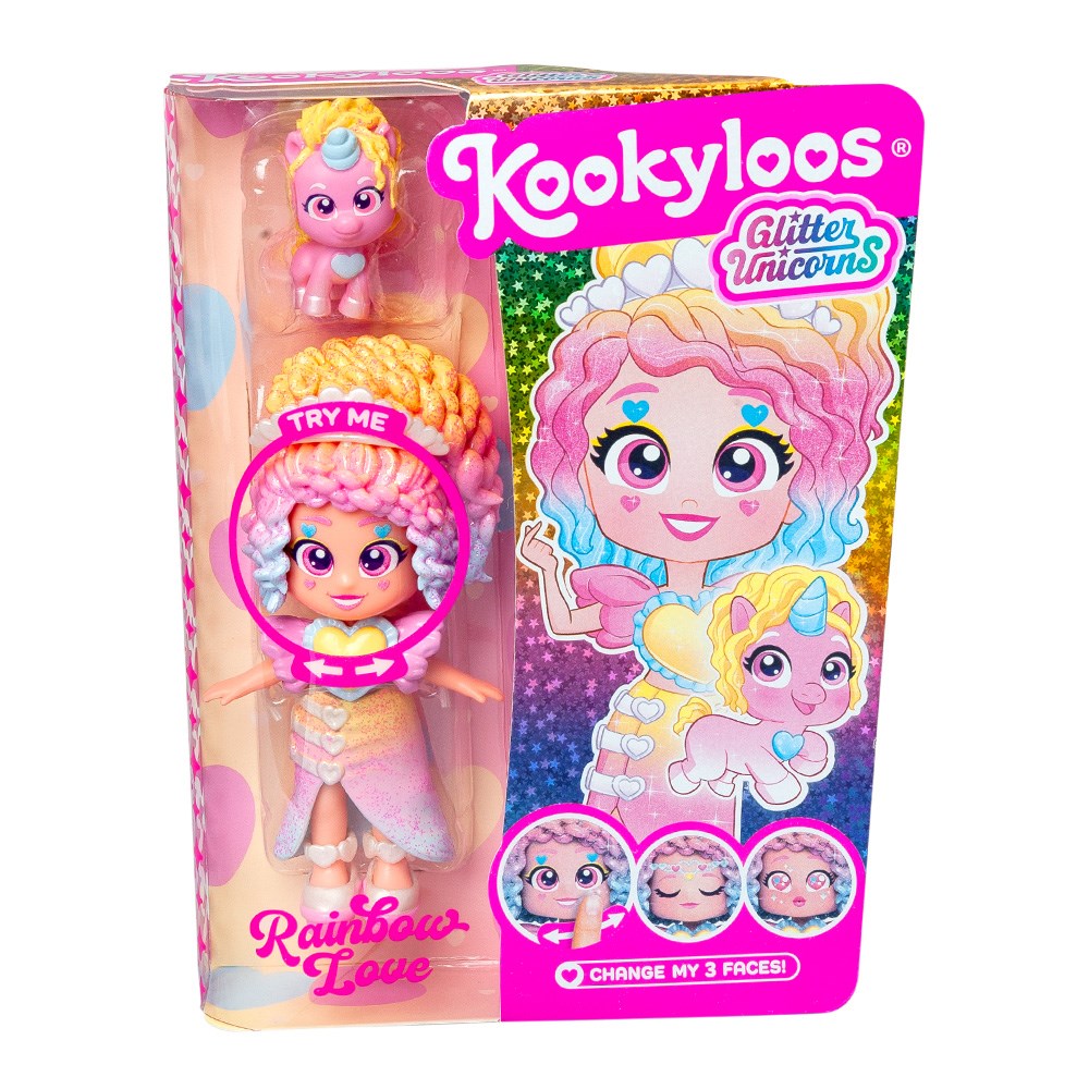 Kookyloos wracają z jeszcze większą dawką magii! Odkryj ich wspaniałe nowe stroje z brokatem, tiary i buciki, które możesz wymieniać między laleczkami! W kolekcji znajdziesz 8 nowych laleczek, każda z 3 minkami, które możesz zmieniać jednym kliknięciem! A to nie wszystko – każda z nich ma wyjątkowego towarzysza: jednorożca! Zanurz się w czarującym świecie Kookyloos i odkryj nową kolekcję Glitter Unicorns. Poczuj magię!