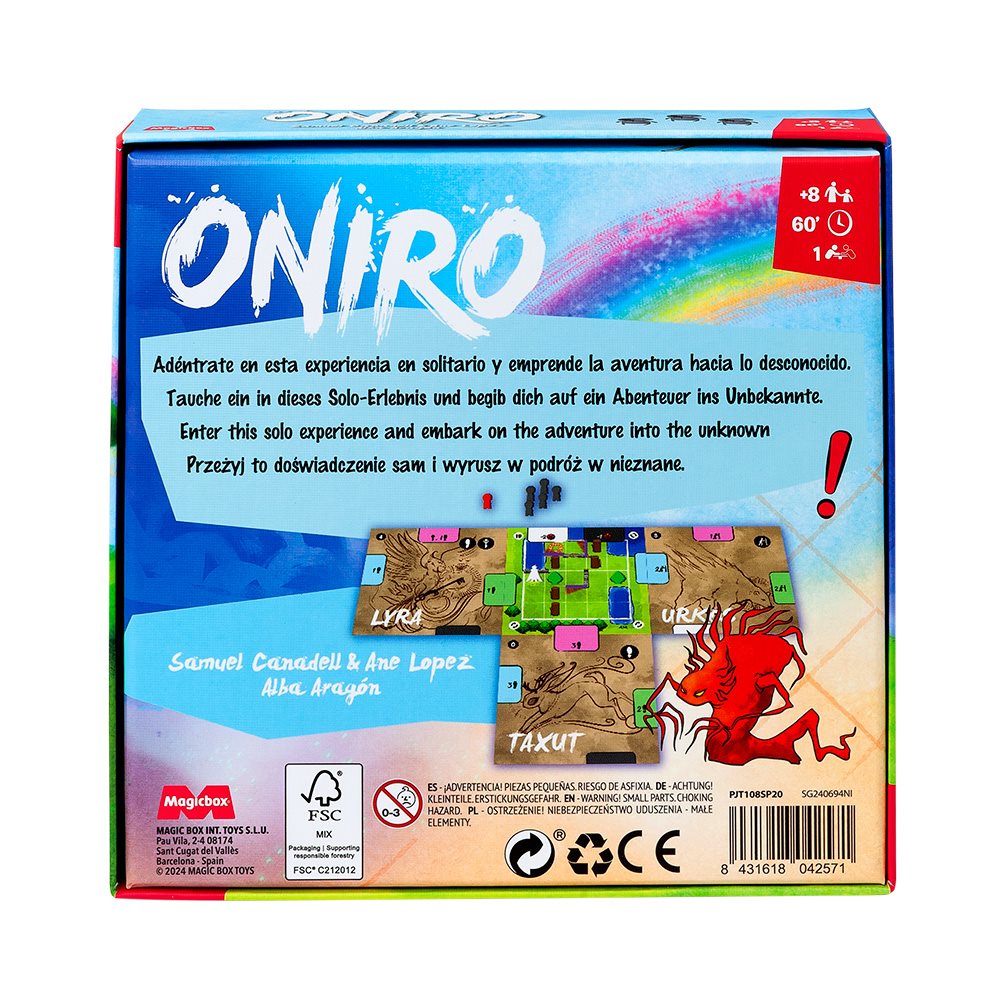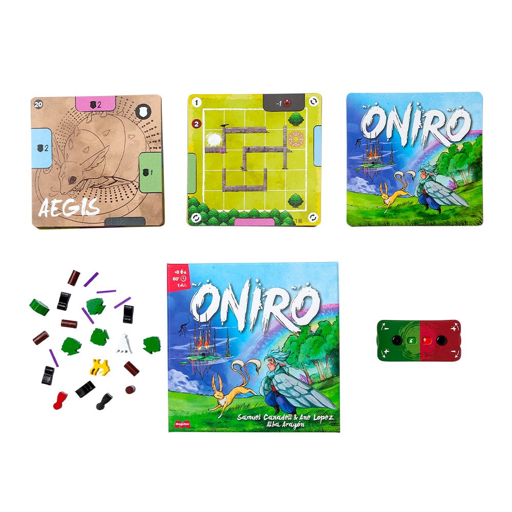 Oniro es un juego de desafíos lógicos en el que debemos resolver puzles utilizando las habilidades de nuestras cartas de Oniro. Al inicio de cada desafío colocaremos las cartas en la posición más adecuada según sus efectos. Al final de cada turno, las cartas rotarán alrededor del desafío, cambiando las habilidades disponibles para el siguiente turno.