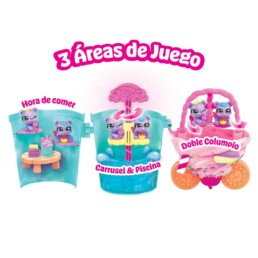 - El carrusel y la piscina, donde podrás colocarlos en el eje para que giren y se deslicen hasta un chapuzón refrescante.
